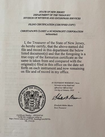 We are indeed a legitimate 501(c)(3) NONPROFIT CORPORATION! Please see the below to view our official certification from the State of NJ Department of Treasury Division of Revenue and Enterprise Services - ChristaPaws Closet at NJ Nonprofit Corporation